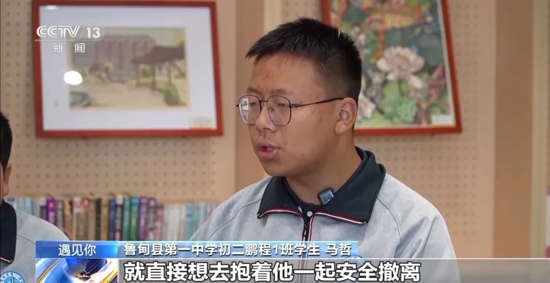 在初二鹏程1班,第一波震感过后,老师迅速引导大家往空旷地点疏散。然而,当所有人都在往教室外撤离时,学生马哲却没有马上走开,他看向双腿行动不便的同桌——马敏欧。