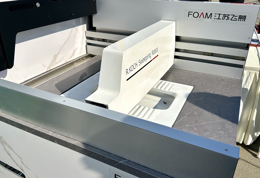 蹲便器自动清洁机器人、自动清洁坐便器、自动清洁洗手台……在上午的活动现场,新民晚报记者看到了江苏飞慕生物科技有限公司带来的几台公厕自动化保洁设备。蹲便器自动清洁机器人在蹲坑上方加装了清扫设备,如厕之后清扫条会自动“横扫”坑位,将污渍和水渍清除干净。整个过程耗时约1分钟,清洁覆盖率超过95%,可以实现“一客一洁”。