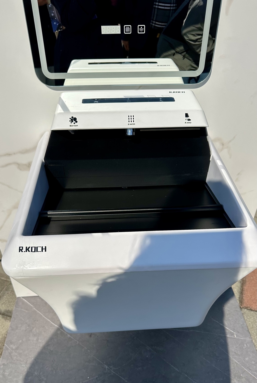 而自动清洁洗手台则将台盆设计成斜坡状,上方给皂、出水、出风。使用者洗手后,一条隐藏的刮板会沿着斜坡自动刮除污渍水渍。