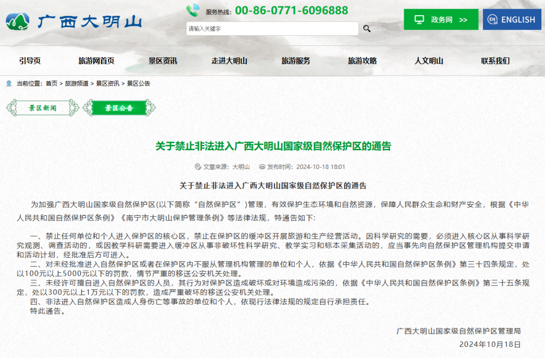 记者查询发现,去年10月,大明山风景旅游区曾发布公告,禁止任何单位和个人进入保护区的核心区,禁止在保护区的缓冲区开展旅游和生产经营活动。违者将进行罚款,情节严重者将移送公安机关处理。