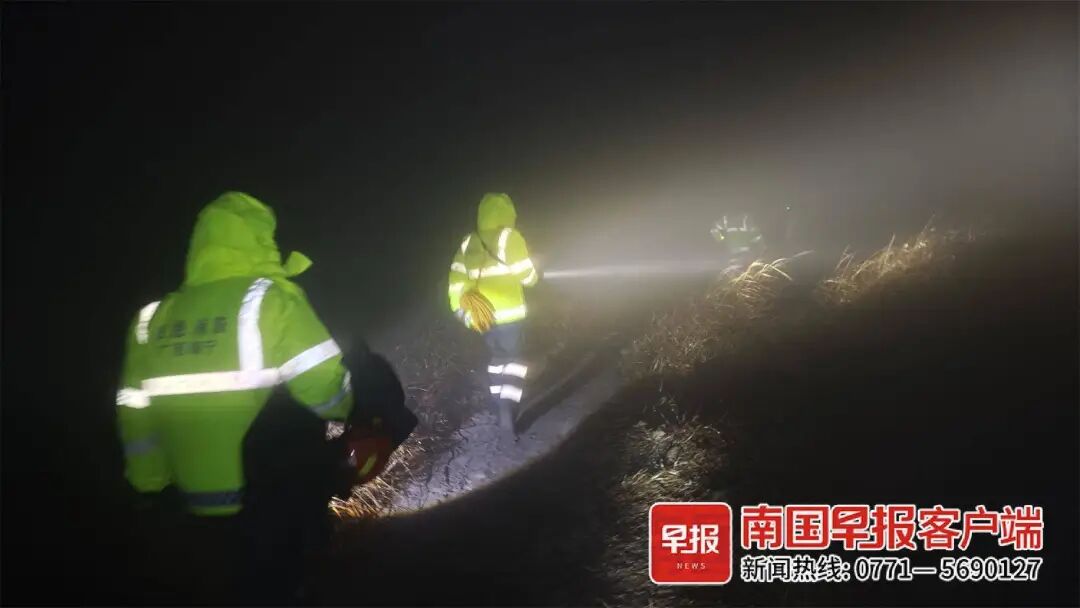 ▲南宁某高校4名大学生在大圣山被困,消防救援人员徒步前往人员被困点。南宁消防供图